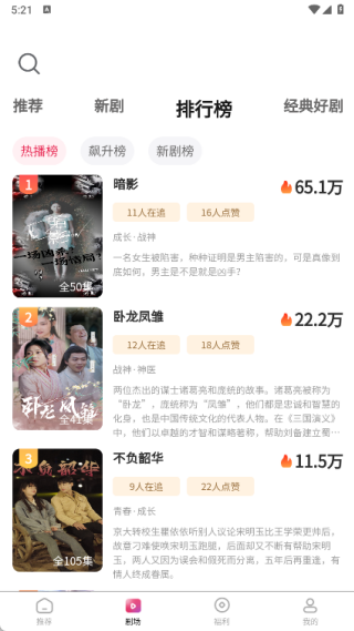 4、在排行榜页面能够查看热播榜、飙升榜和新剧榜等各类榜单的排名情况。