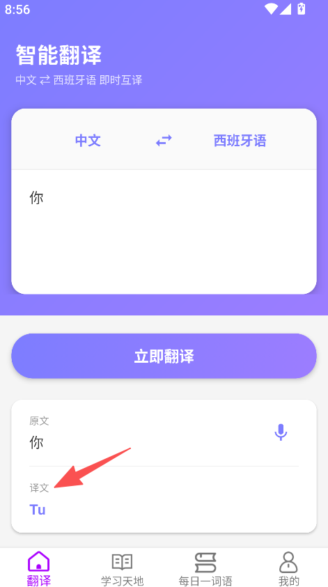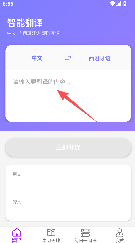 1、支持中文和西班牙语之间的双向即时互译,当输入需要翻译的内容后,点击“立即翻译”按钮,就能快速得到对应的译文,以此满足双语转换的需求。