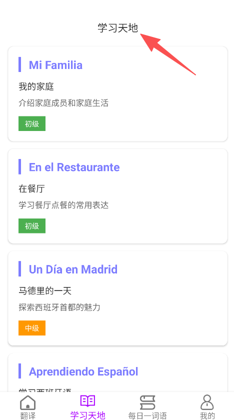 3、切换到学习天地板块,挑选对应的主题来开展西班牙语学习。