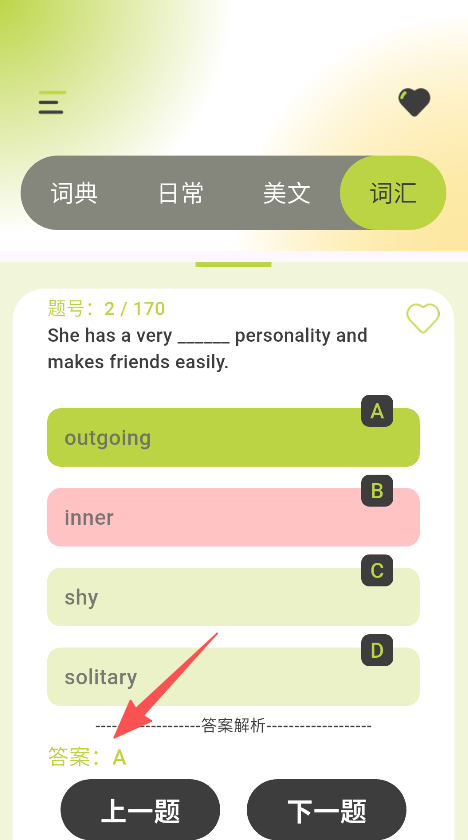 3、进入词汇板块,做词汇练习题并查看答案解析。