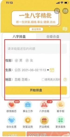 1、在常用的求测界面中,能获取八字精批、合婚排盘这类服务,填写相关信息即可启动排盘流程,还设有情感、事业等不同分类板块。