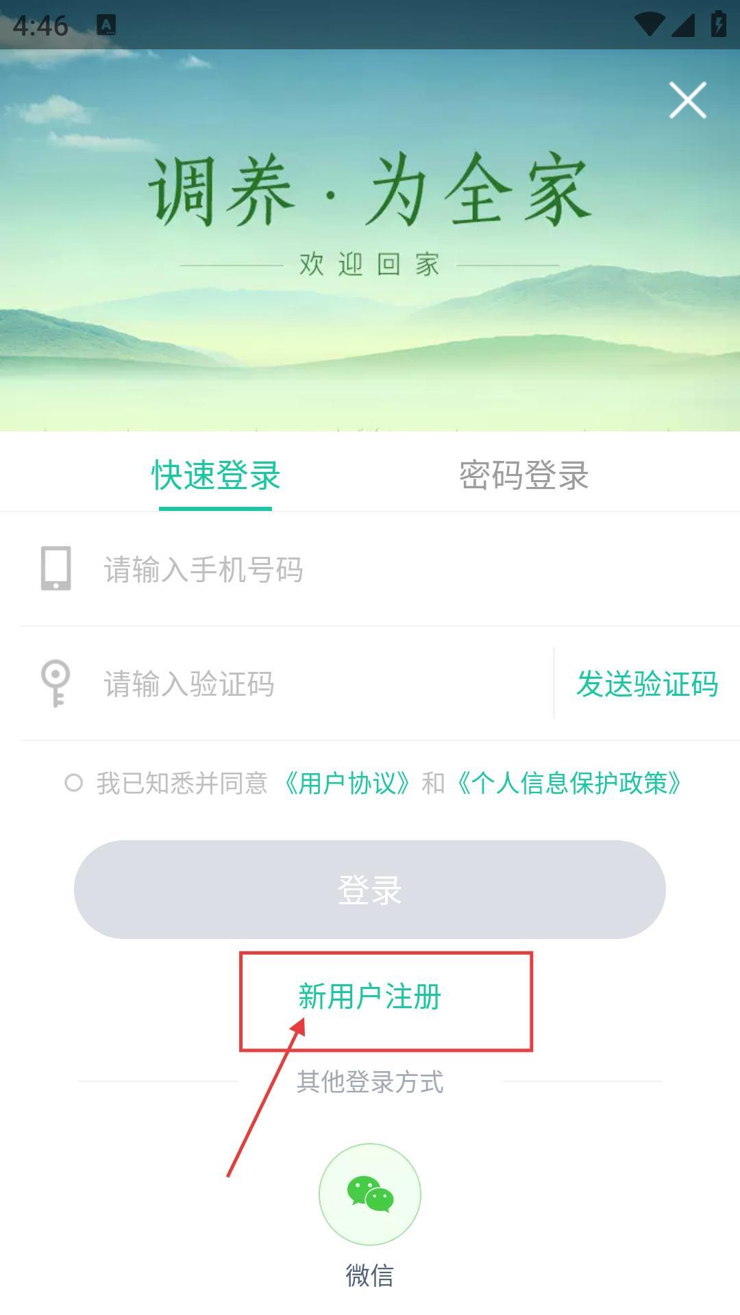 3、要是还没有注册账号,在登录界面点击【新用户注册】,就能进入注册流程。
