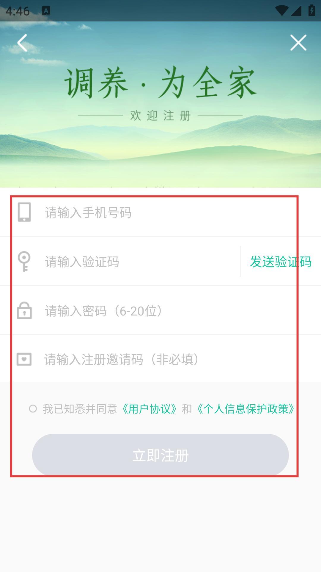 4、注册“调养家”平台时,请按顺序填写【手机号码】【验证码】【密码】,注册邀请码为非必填项,完成上述步骤即可完成注册并登录平台。