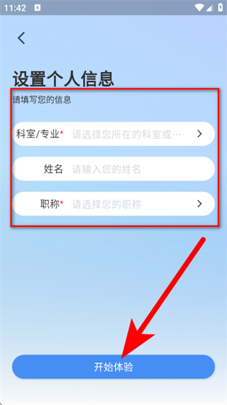 4、进行个人信息设置,填写科室专业、姓名与职称,点击“开始体验”按钮,即可完成注册登录流程。