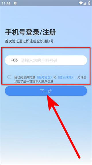 在手机号登录注册页面,输入手机号码并勾选相关选项后,点击下一步按钮。