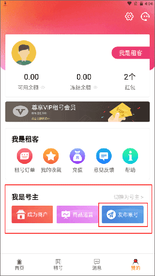 1、首先进入优号租最新版首页,切换至【我的】功能模块界面。该界面涵盖租客与号主两种身份,若要发布游戏账号信息,点击右侧的“发布账号”按钮即可。