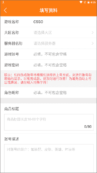 3、接下来需要填写你的游戏账号资料,务必确保信息真实,否则可能会对平台信誉造成影响。最后按照提示完成相关操作,就能成功发布了。