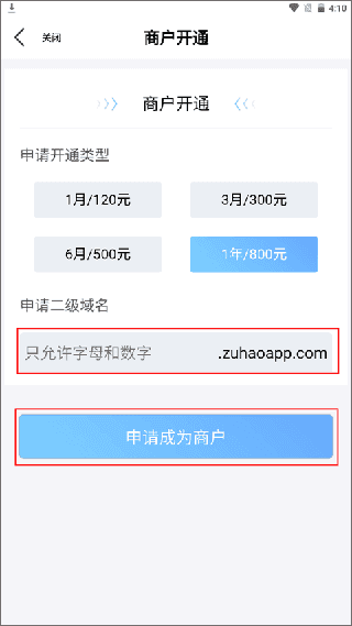 (3)接下来是申请你网站的二级域名,按照提示输入你预先拟定的名称,然后点击“申请成为商户”按钮,之后等待工作人员的审核通知就行。