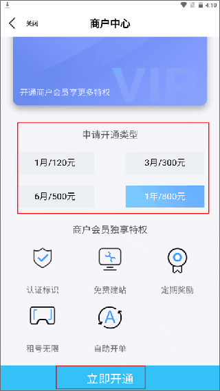(2) 请选择您申请开通的类型,了解商户会员专享的特权,随后点击立即开通。