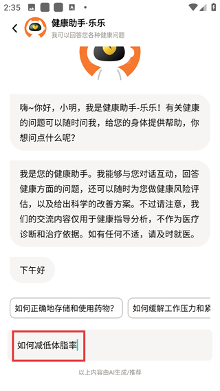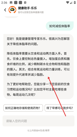4、查看健康助手·乐乐关于降低体脂率的解答内容。