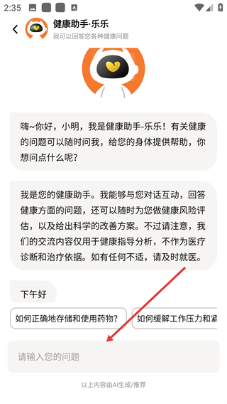 2、在健康助手·乐乐界面的输入框中输入健康问题。