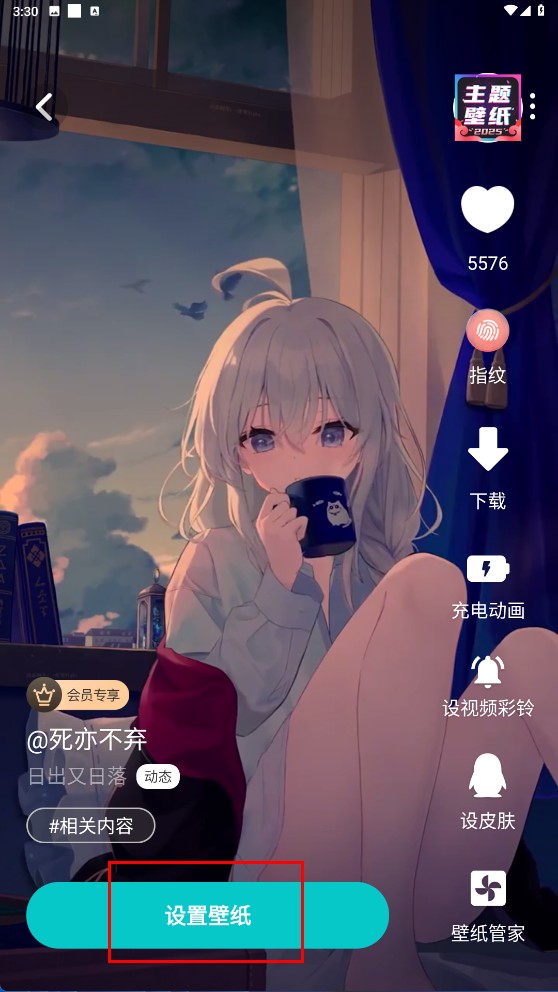 在壁纸详情页面,你可以点击【设置壁纸】功能按钮来应用该壁纸,还能进行点赞等相关操作。
