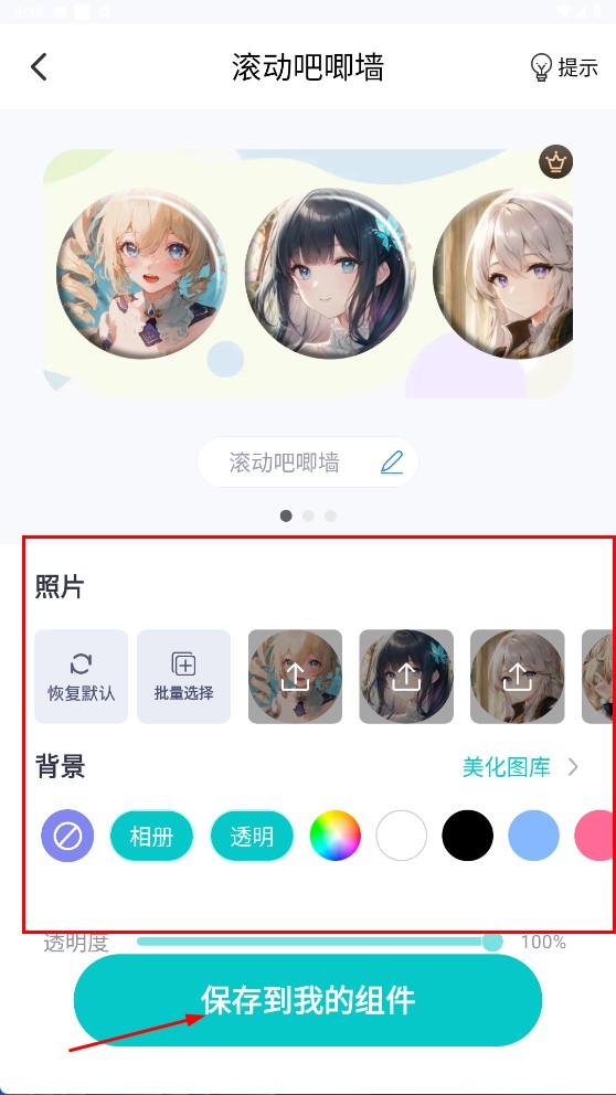 4、进入滚动吧唧墙的设置页面后,能够挑选照片、设置背景等,操作完成后点击【保存到我的组件-功能按钮】即可。