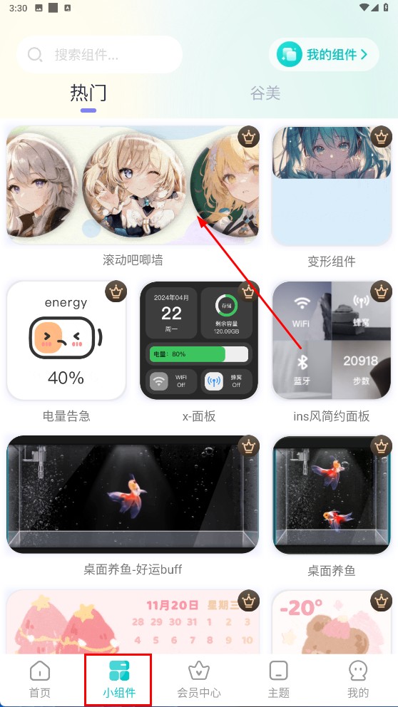 3、点击底部的【小组件-功能按钮】,进入小组件页面后,挑选自己感兴趣的小组件,比如滚动吧唧墙。