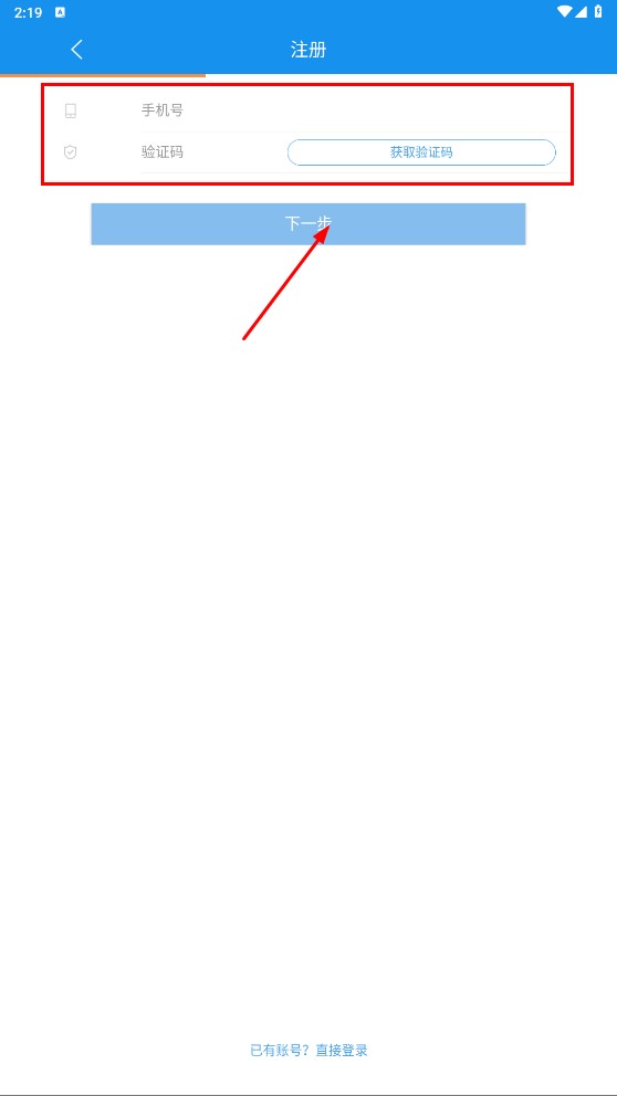 4、进入注册界面后,先填写手机号,接着点击【获取验证码】功能按钮,输入收到的验证码,再点击【下一步】功能按钮,即可完成注册流程。