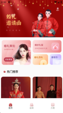 首页设有婚礼策划、婚纱礼服、婚礼百科、查吉日等功能板块,此外还包含热门推荐内容。