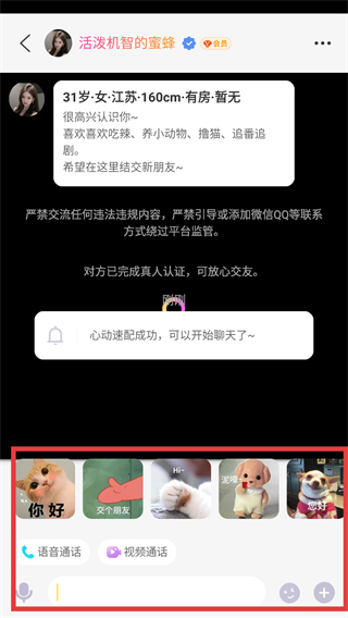4、匹配成功后,在聊天界面能够发送预先设置的话术、发起语音或视频通话,也可以通过输入框和对方开展交流互动。