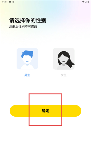 1、在【男生】与【女生】这两个性别选项中进行选择(注册完成后该信息将无法修改),随后点击【确定】按钮,即可完成性别信息的设置操作。