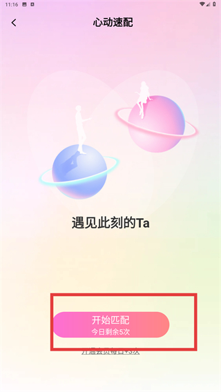 2、进入【心动速配】页面后,找到并点击显示“今日剩余5次”的【开始匹配】按钮,即可启动系统的匹配流程。