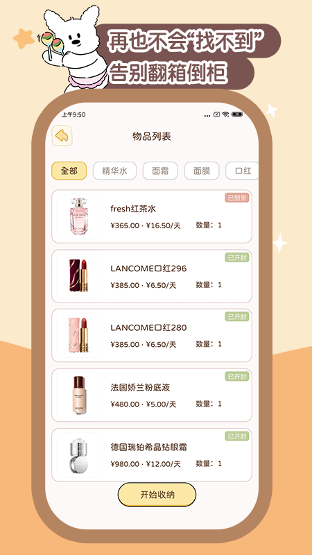 收纳小屋App是一款为收纳爱好者量身打造的物品收纳工具,整体采用清新可爱的设计风格。用户可以随时在线记录家中各类物品,涵盖化妆品、药品、饰品、食品、书籍等多个品类。每添加一件物品时,都能设置过期提醒功能,帮助你避免因遗忘使用导致物品过期浪费。有需要的用户欢迎使用。