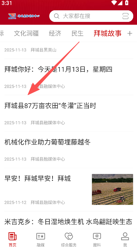 1、可进入拜城故事板块进行浏览,从中获取本地新闻、农业、生态等各类资讯,从而了解拜城当地的最新动态。