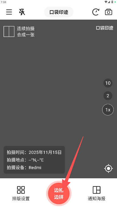 2、在拍摄设置页选择连拍张数点击“边拍边拼”。