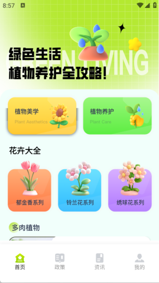 1、首页设置了植物美学、植物养护、花卉大全、多肉植物等板块内容。