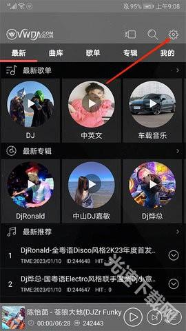 1、在手机上找到并打开清风音乐应用,进入其主界面后,点击右上角的“齿轮”形状设置图标。