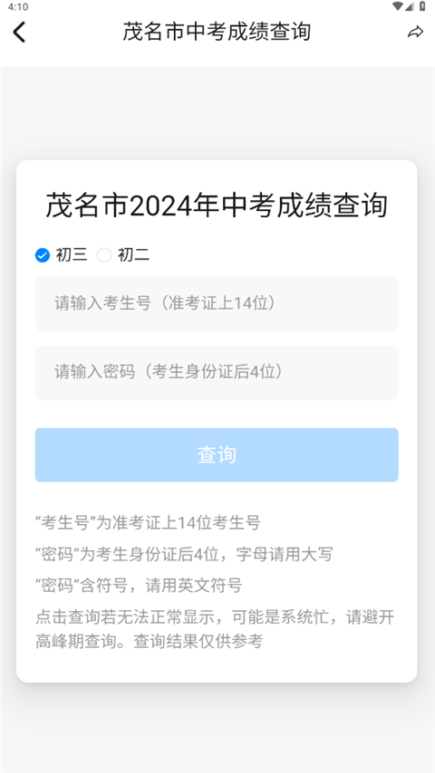 3、输入考生相关信息即可进行查询(支持初三、初二学生成绩查询)。