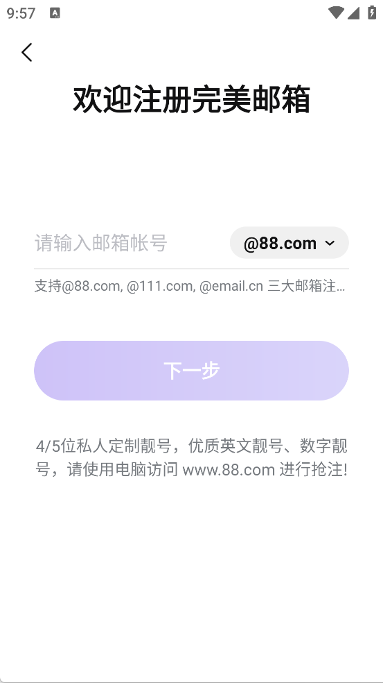 完美邮箱注册目前仅支持88完美邮箱、111完美邮箱、Email.cn这三大域名。