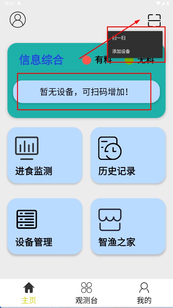 1、点击页面右上角的扫码图标,接着在弹出的选项中选择【扫一扫-功能选项】,通过扫码操作来添加设备。