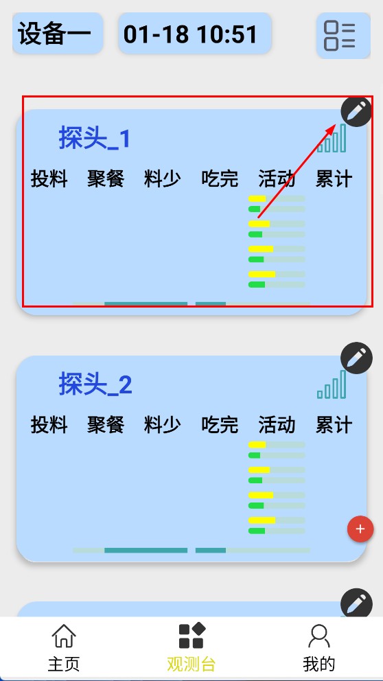 3、在观测台页面,点击【探头_1-设备探头】旁边的编辑图标,能够查看或编辑该探头对应的投料、聚餐等相关数据。