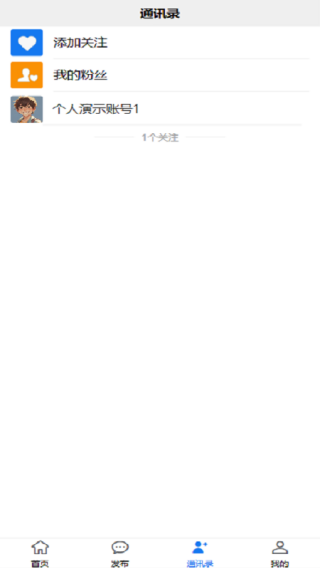 3、通讯录模块,可查看联系人、关注对象及粉丝的相关信息,便于在线沟通交流,此外还能对账户详情进行管理。