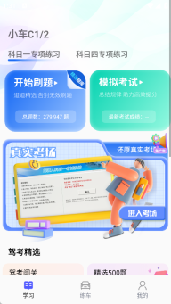 1、在学习页面里,用户能够开展刷题、模拟考试等知识练习活动,此外还设有驾考精选之类的内容板块。