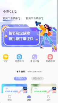 2、在练车页面,你可以了解科目二与科目三的专项练习内容,随时学习各类相关知识。
