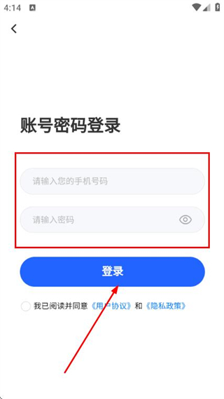 3、进入账号密码登录页面后,依次填写手机号与密码,勾选相关协议,最后点击登录按钮,即可完成账号登录流程。