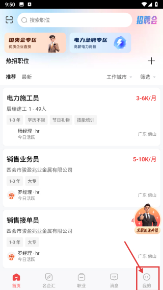 1、进入招聘分类板块,点击底部导航栏的“我的”选项,即可进入个人中心页面。
