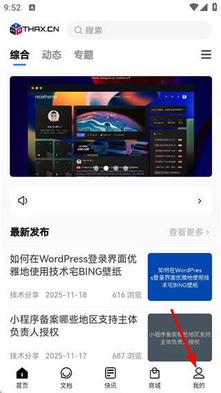 1、在技术宅首页,点击右下角的“我的”选项,进入个人中心页面。