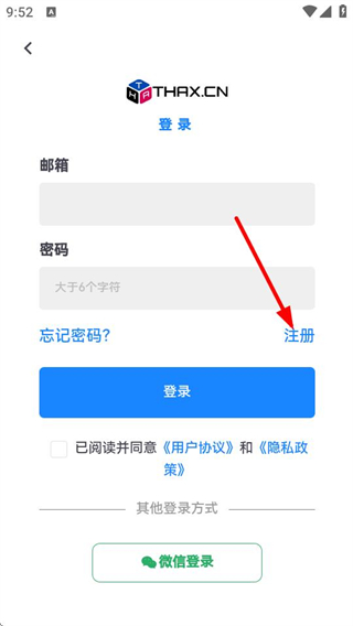 3、在登录页面,点击注册选项,进入注册页面。