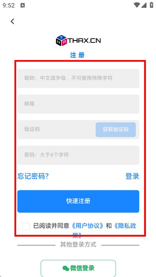 4、进入注册页面后,依次填写相关信息、勾选协议,再点击快速注册按钮,即可完成账号注册流程。