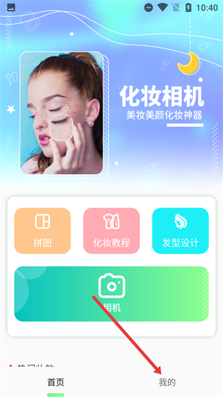 1、在【化妆相机】首页点击底部的【我的】按钮,这个首页包含【拼图】【化妆教程】【发型设计】等美妆类功能选项。