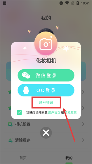 3、先勾选【我已阅读并同意用户协议和隐私政策】,然后在登录弹窗里选择【账号登录】这一选项。