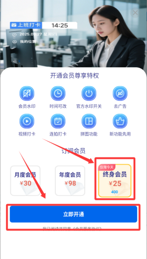 2、选择右边的终身会员点击立即开通。