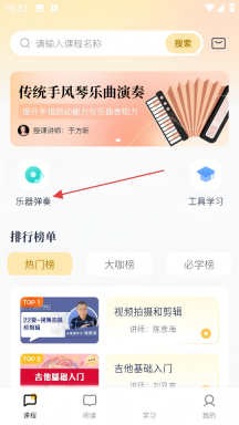 2、在课程首页找到【乐器弹奏】选项并点击,即可进入乐器弹奏课程的列表页面。