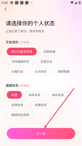 3、进入个人状态选择页面后,需依次选定交友目的与婚姻状态(二者均为单选项),确认选择完毕后点击【下一步】,即可进入账号信息的填写流程。