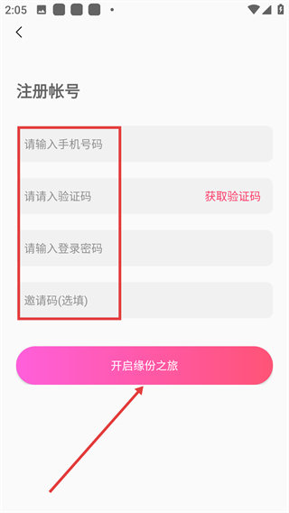 4、进入注册账号页面后,需填写手机号码,获取并输入验证码,设置登录密码(邀请码为选填项),完成这些操作后点击【开启缘份之旅】按钮,即可完成注册流程。