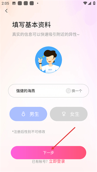 2、进入基本资料填写页面后,需选定昵称(可更换)和性别(注册后无法修改),完成这两项操作后点击【下一步】,以继续后续的注册步骤。
