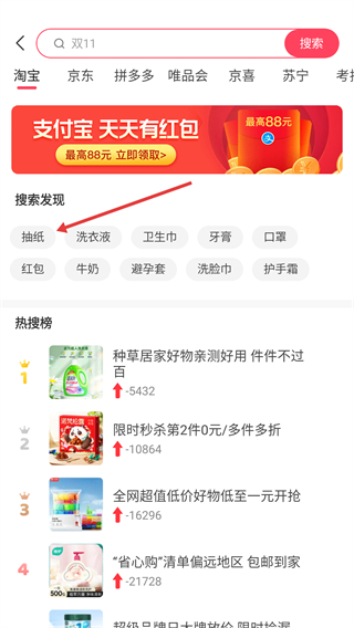 在搜索页面,点击【搜索发现】里的【抽纸】标签,就能直接跳转到抽纸类商品的搜索结果页面。
