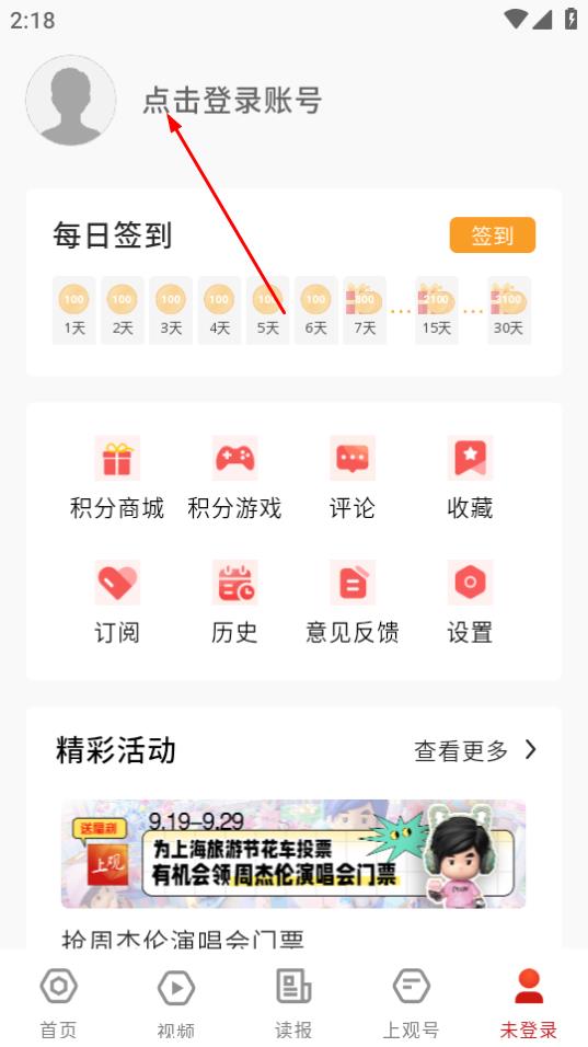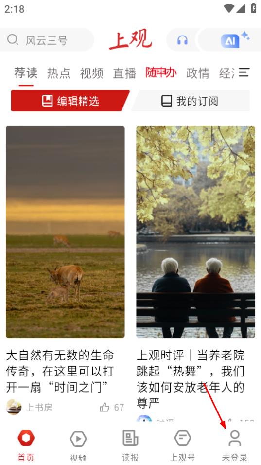 1、打开上观新闻后,要是需要登录账号,点击页面右下角的“未登录”按钮即可。