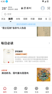 1、打开数字深圳App的首页,能看到“关注”“推荐”“本地”“视频”“科普”等多个内容板块,这些板块涵盖了新闻热点、实用信息以及科普知识。